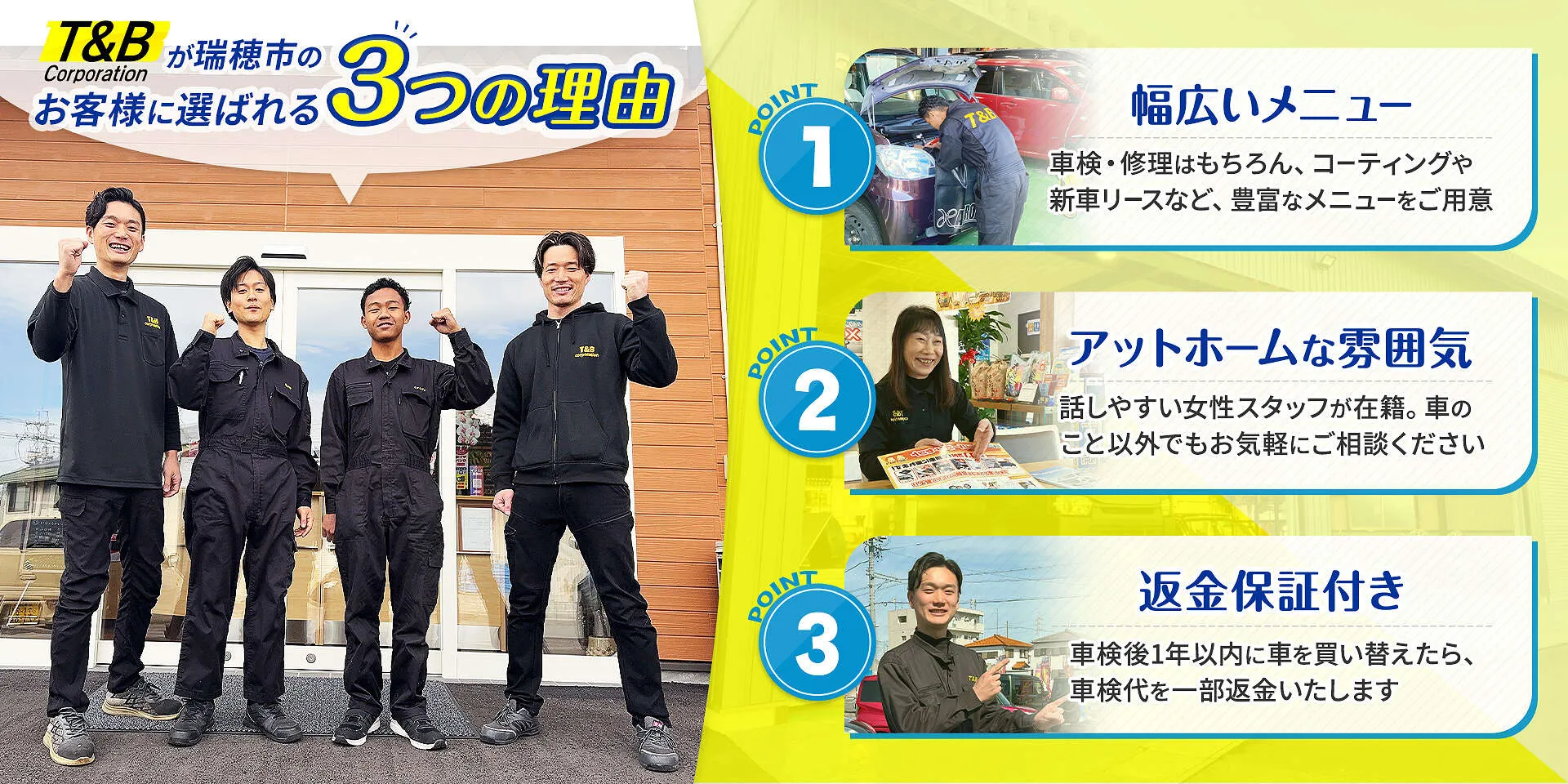 岐阜県瑞穂市のT&Bコーポレーション なら、カーリース成約後の車検やメンテナンスなどクルマのことはすべてお任せいただけます。