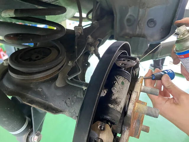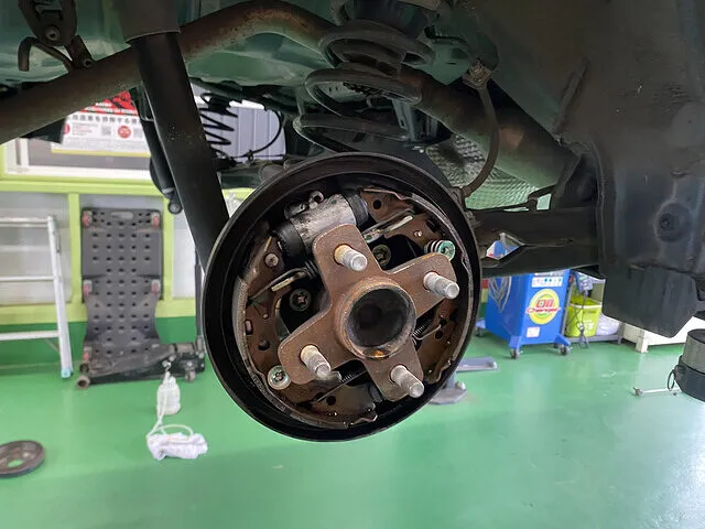 後輪ドラムブレーキの清掃やグリスアップは、車検整備の中でも普段目にしない部分ですが、とても大切な作業です。