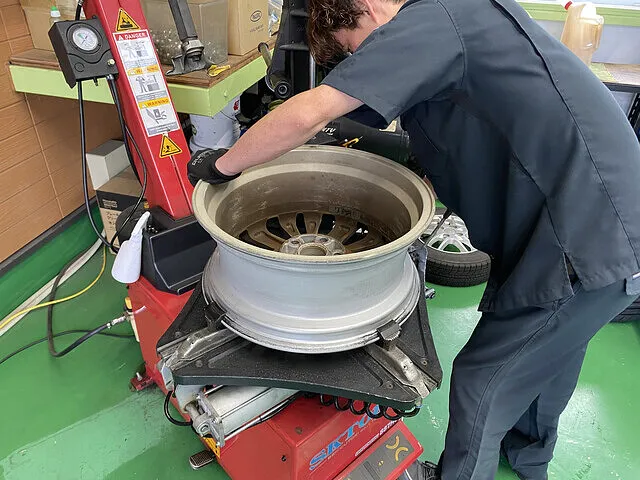 古いタイヤを取り外し、ホイールの状態を確認。ひび割れや曲がりなどがないかをチェックします。