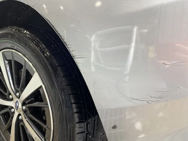 傷を確認すると、タイヤ前方は擦り傷とウロコ状の傷、タイヤ後方は塗装がえぐれて下地の黒色が見えていました。