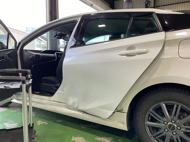 プリウスの後部ドアの修理をご依頼いただきました。ドアが凹んで歪んだ状態で、開け閉めのときにも少し違和感が出ていました。このくらいの歪みになると、板金で元の形に戻すより、ドアごと交換したほうが仕上がりもきれいで費用も抑えられることが多いため、今回は中古ドアを使った修理をおすすめしました。