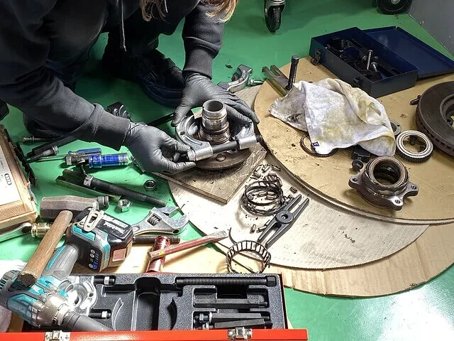 作業はタイヤを外し、ブレーキ周りを取り外してハブ部分を分解していきます。